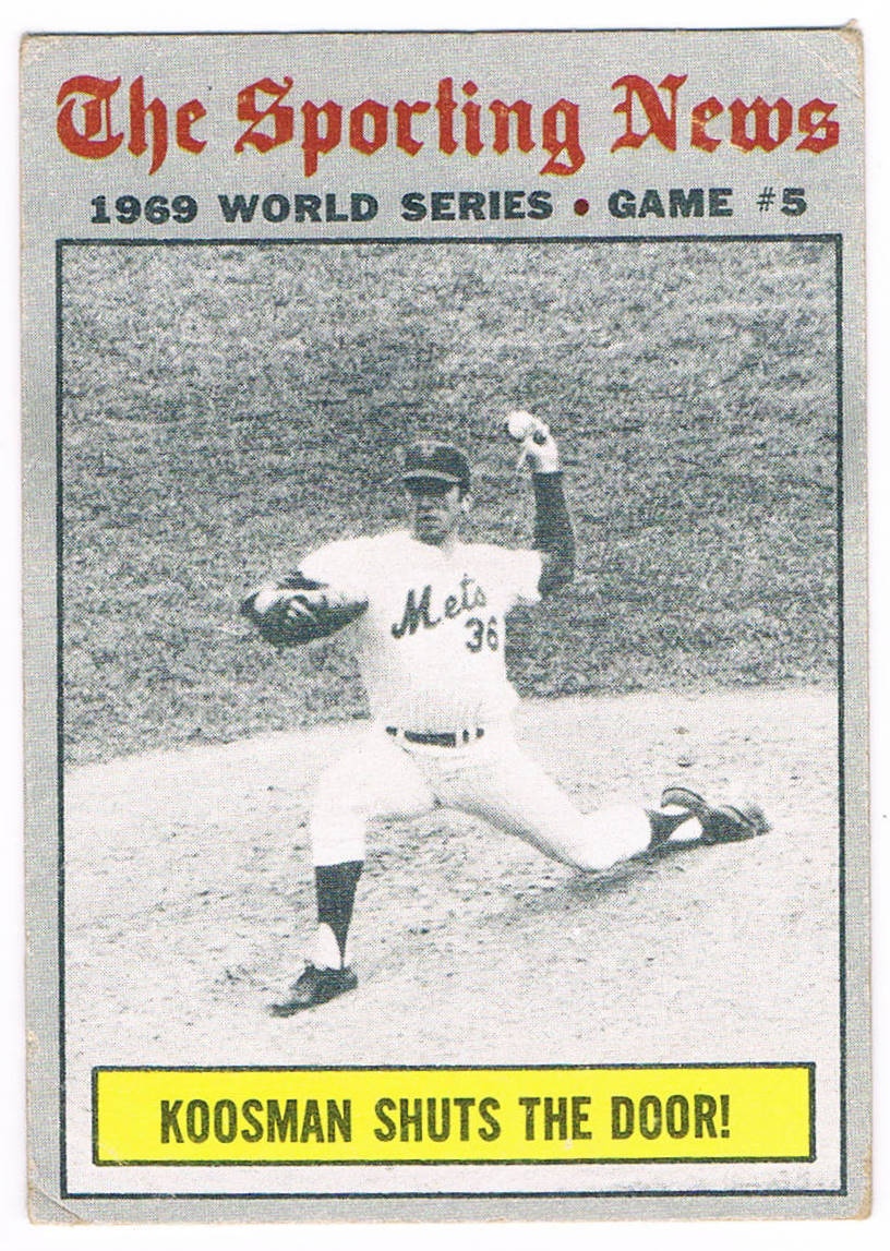 The picture on this card is from the deciding game of that series. Though the game is best remembered for the incident involving Gil Hodges showing a shoe polish scuff on a ball to get Cleon Jones awarded first base, Koosman's composure on the mound after getting into a 3-0 hole early in the game and going on to finish the game without giving up any more runs is significant.