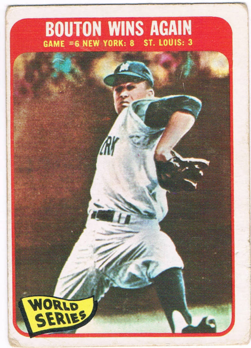 Instead, they faced the St. Louis Cardinals, a team that had its own monster pitcher in Bob Gibson. As shown in the card above, Jim Bouton won a pair of games and Mel Stottlemyre tamed Gibson in Game 2, but the Cardinal ace closed the door on the Yankees in Game 7.